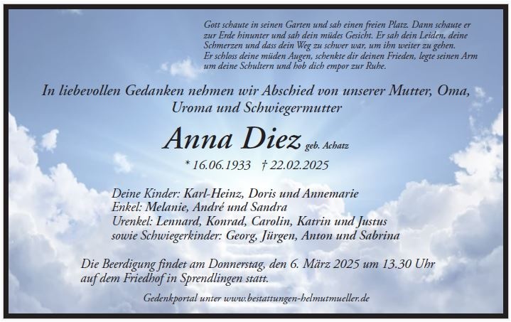 wir wünschen Ihnen von Herzen viel Kraft, dass Sie Menschen um sich haben, die Ihnen in dieser schweren Zeit beistehen und Halt geben. Zusätzlich können Sie auf dieser Gedenkseite Erinnerungen teilen und so das Andenken gemeinsam wachhalten.